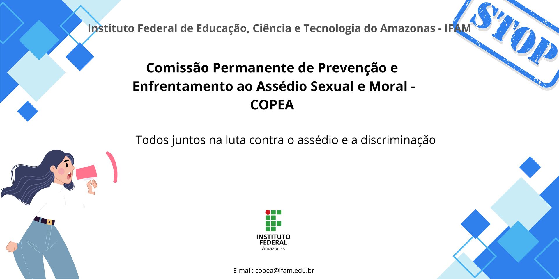A Comissão Permanente de Prevenção e Enfrentamento ao Assédio (COPEA) foi designada mediante a Portaria nº 2.219/GR/IFAM, de 20 de dezembro de 2022, com o objetivo de fortalecer as ações institucionais que buscam erradicar o assédio e a discriminação dentro do Instituto. A comissão atualmente é responsável pelo desenvolvimento de políticas, elaboração de planos de ação, cartilhas, informativos e relatórios, criação de campanhas, entre outras atividades, que buscam tornar a instituição um local seguro e livre dessas mazelas.